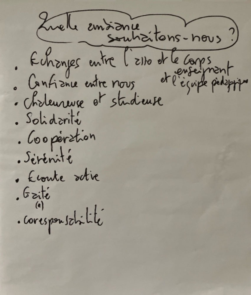 Nous avons été accompagnés dans cette démarche par Frédéric Boudier, facilitateur de travail collectif, qui nous a guidés au cours de deux soirées de travail. Son accompagnement nous a permis de redéfinir nos choix du quotidien, d’identifier nos forces individuelles et collectives, et de renforcer la synergie entre l’équipe éducative et l’association.